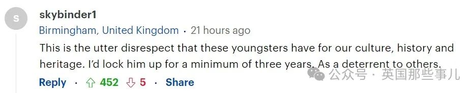 “这就是年轻人对我们的文化、历史和遗产的不尊重。我会把他关起来至少三年。作为对其他人的警告。”