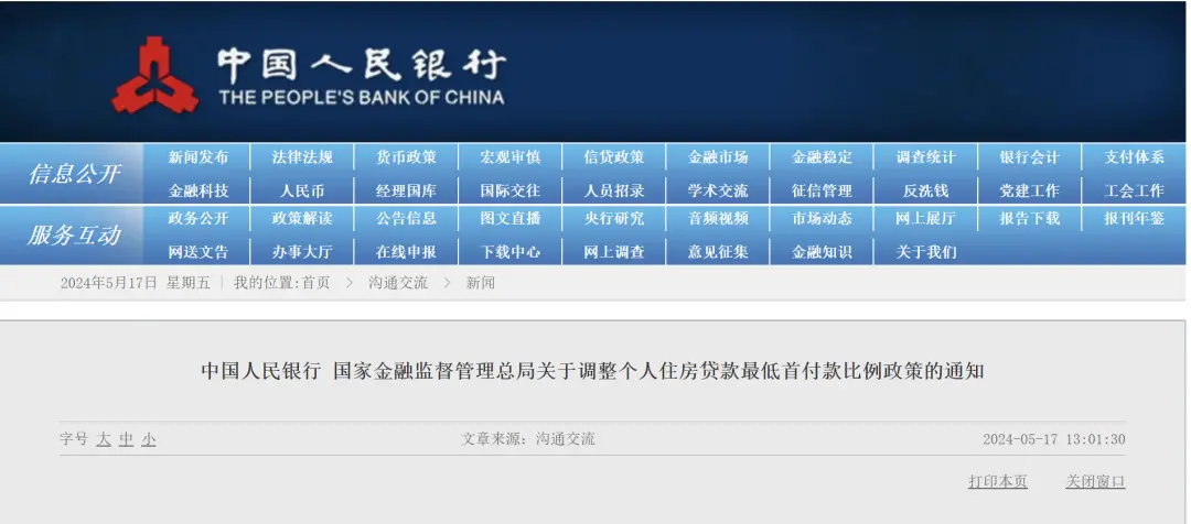 5月17日中午,央行官網發布《中國人民銀行關於下調個人住房公積金貸款利率的通知》《中國人民銀行關於調整商業性個人住房貸款利率政策的通知》《中國人民銀行 國家金融監督管理總局關於調整個人住房貸款最低首付款比例政策的通知》。