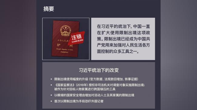 报道发现,过去一年来,从中央到地方的各级部门不断出台新的私人出境限制规定,对已覆盖的人群进行更严格的审查。受限群体均需上缴护照,若要出国旅行,必须申请“借用”护照,还需经过复杂且不透明的审批程序。