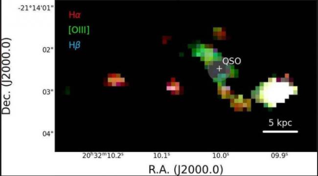 這是壹張PJ308-21系統中氫(紅色和藍色)和氧(綠色)譜線發射的地圖,圖中遮蔽了來自中央類星體的光線。 在這張地圖中,類星體宿主星系和伴星系的不同顏色揭示了其中氣體的物理特性。(圖擷取自義大利國家天體物理研究所INAF專頁)