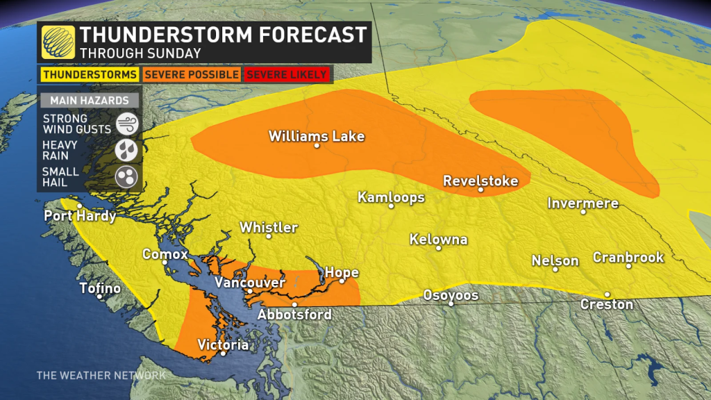 预计周日BC省中部内陆地区将再次遭遇恶劣天气,暴风雨可能会在乔治王子城和威廉姆斯湖附近形成。