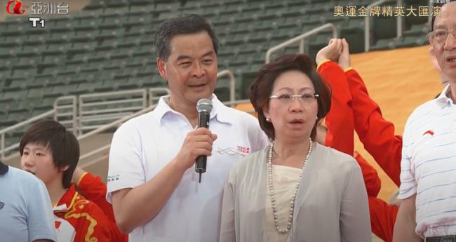 2012年梁振英与中国运动员高歌《真心英雄》。亚洲电视截图
