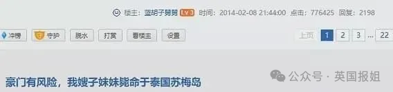 当时一位匿名“蓝胡子舅舅”的网友,在娱乐八卦板块发布了一个《豪门有风险,我嫂子妹妹毙命于泰国苏梅岛》的帖子。