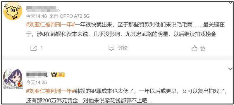 正如網友所說,劉亞仁不是韓國娛樂圈第壹個被輕判的明星,韓國公眾人物犯罪成本太低了,難怪韓國的影帝大咖們排著隊違法犯罪,壹個個就算進了監獄也不怕,出獄之後隨便就復出了,照樣受人追捧——劉亞仁都是帶著笑容進法院聽判決的。