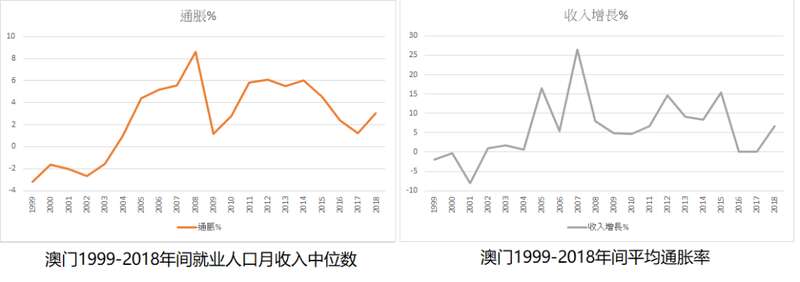 有一点和中国香港、新加坡这两个经济体不同的是,澳门由于过度依赖博彩业且经济规模相对更小,它的通胀率往往偏高并且波动幅度也更大,这对收入“被平均”的一部分人来说就非常不友好了。