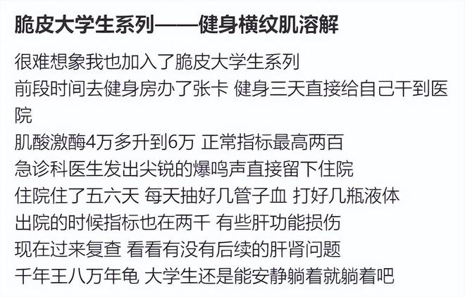 不過,雖然名字聽起來嚇人,但橫紋肌溶解症並不是說肌肉真的會溶解,而是過度運動後,肌肉受傷和身體反應的壹種綜合表現。