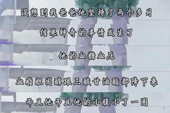 根據Ella說,她爸爸堅持了叁個月,血糖血壓膽固醇都有所降低,腹部的脂肪也減少了。
