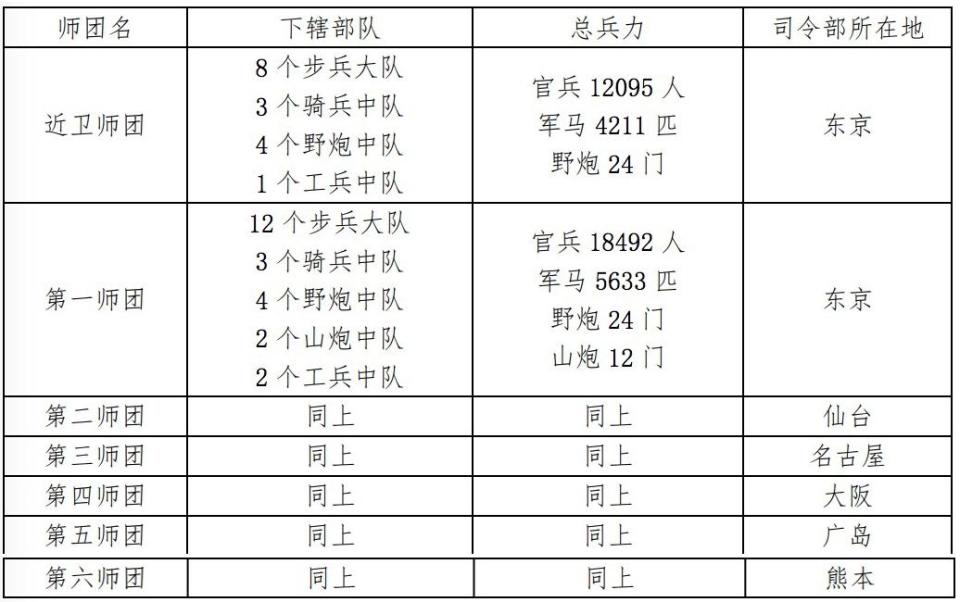 日本明治政府成立后,于1872年颁布征兵令,实行类似全民皆兵的义务兵制(年满17岁至47岁的男子需要服常备兵役,现役服3年,之后服4年预备役,再之后服5年后备兵役。其余不在常备、后备兵役的男子,可以编入国民兵役),彻底改革海、陆军的军制。至甲午战争爆发时,日本陆军由野战队、守备队、补充队、国民军构成。其中的主力是作为野战队的7个野战师团,即近卫师团和第一至第六师团,每个师团下辖旅团、联队、大队、中队、小队等单位,总计7个野战师团的兵力为123047人。在战时,师团可以单独承担军事行动,也可以根据需要将若干个师团组合为军,战时还将给军、师团配置野战电信队、兵站辎重等部队,并随行军夫(协助部队搬运物资的民夫)。