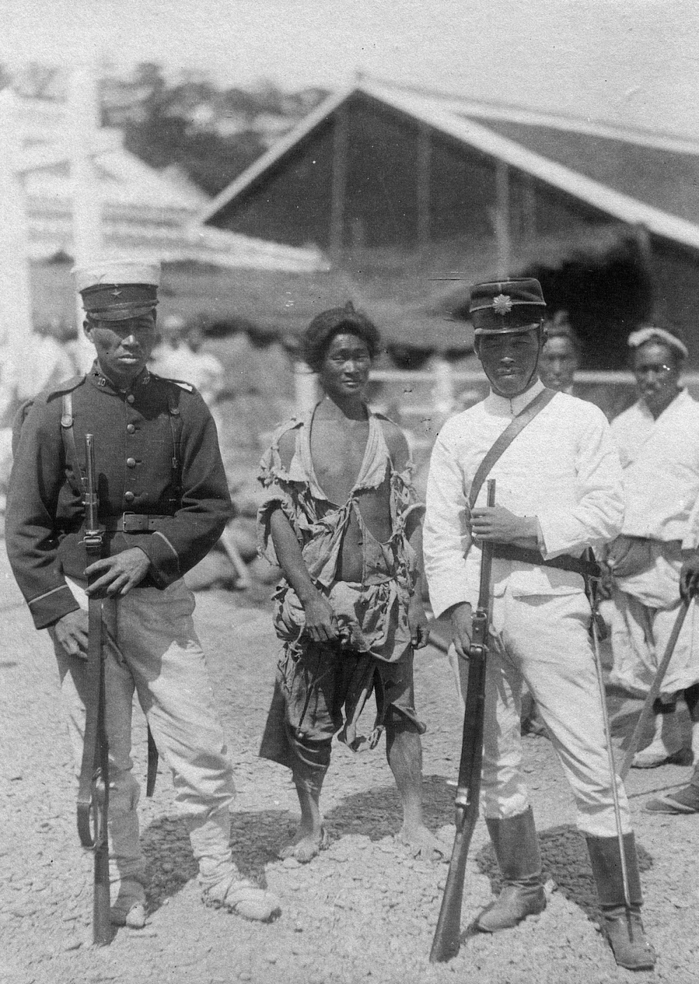 甲午战争时朝鲜街头的日本陆军。照片中左侧是步兵第十联队的一名二等卒,右侧是身着夏季制服的宪兵。