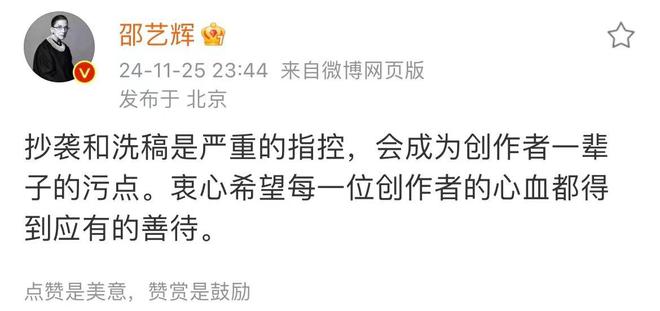 11月25日,《好東西》導演邵藝輝在其實名微博中寫道:“抄襲和洗稿是嚴重的指控,會成為創作者壹輩子的污點。衷心希望每壹位創作者的心血都得到應有的善待。”