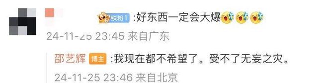 當晚,有網友在評論區回復:“《好東西》壹定會大爆”,邵藝輝回復該條評論:“我現在都不希望了,受不了無妄之災。”