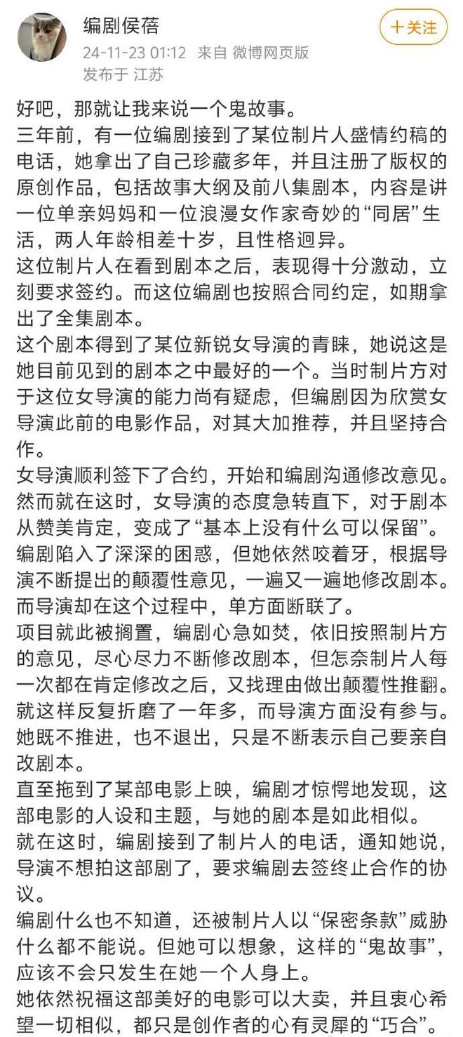 事情的起因是,11月23日,編劇侯蓓在社交網絡發文稱自己有壹個“鬼故事”——叁年前,她拿出了已注冊版權且珍藏許久的原創劇本,與某制片人達成合作,該劇本圍繞單親媽媽和浪漫女作家的“同居”生活展開。起初制片人對劇本拾分看好並與之簽約,而後引入了新銳女導演壹同合作。但此後導演對劇本的態度卻急轉直下,要求進行大量修改。侯蓓按照要求耗時壹年多進行修改,最終卻遭遇了項目終止導演退出的結局。