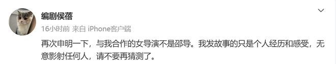 11月25日,編劇侯蓓再次發布微博聲明,自己“合作的女導演不是邵導。發故事的只是個人經歷和感受,無意影射任何人”。