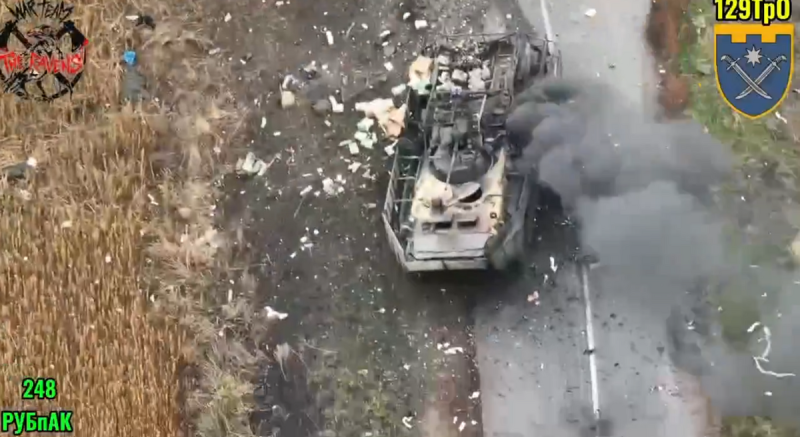 乌克兰第 129 国土防御旅内的「乌鸦」部队在某处战场袭击俄军装甲车与补给车。 图:翻摄自 NOELREPORTSX 帐号