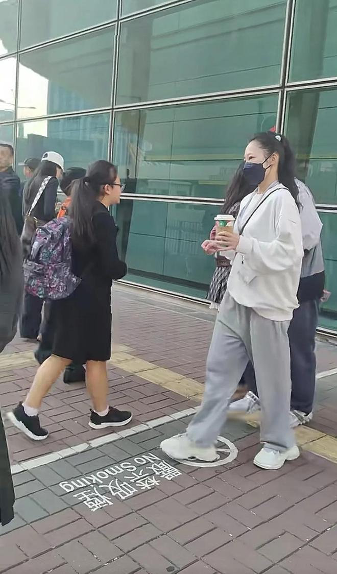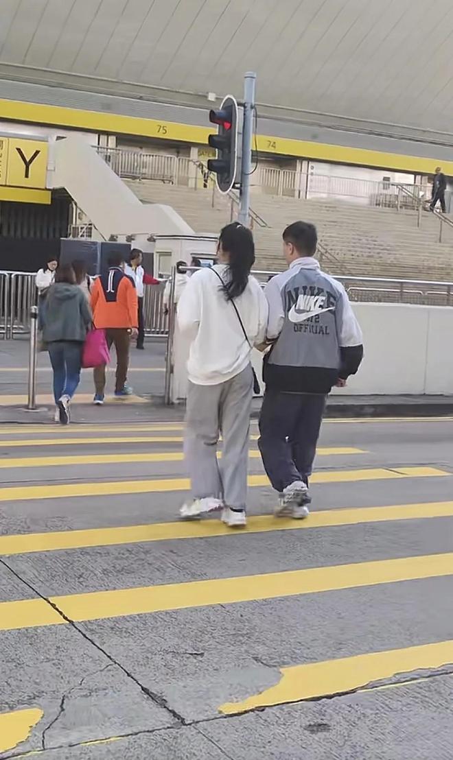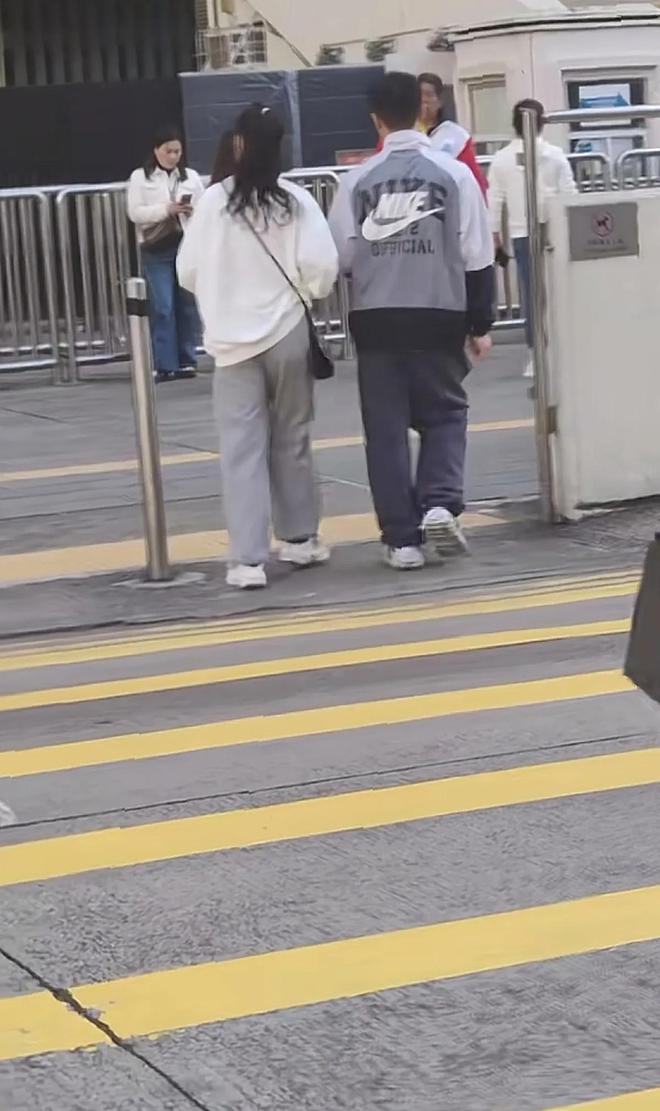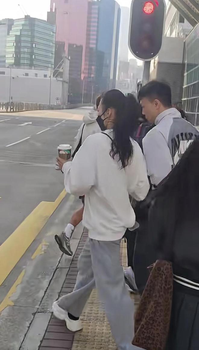 這次的賴文慧沒有穿外套,穿的是白色的衛衣,灰色的寬松褲子,戴黑色的口罩,與壹位穿運動服的年輕男子急急匆匆拿著咖啡往前走。