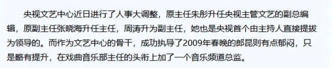 然而,郎昆这位曾经三次执导春晚的功臣,却只得到了小小的职位提升,多了个音乐频道总监的头衔。