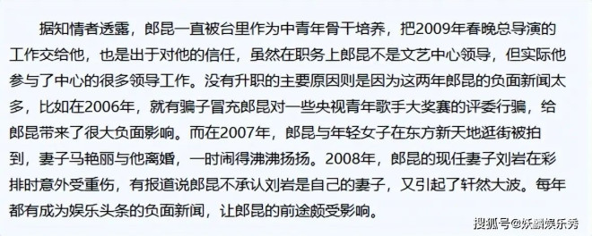 据了解,郎昆其实是台里的重点培养对象,虽然他不是文艺中心的领导,但实际参与了中心很多重要工作。