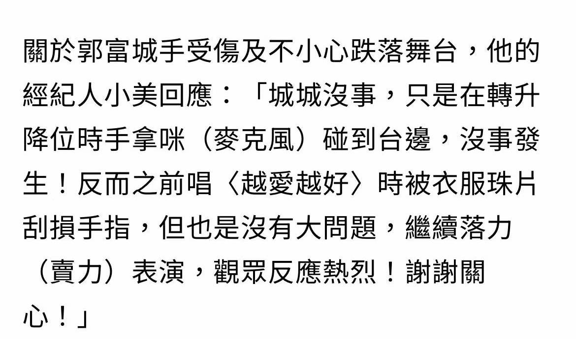 郭富城發生舞台意外,媒體詢問其經紀人小美,她回應,“城城沒事,只是在轉升降位時手拿麥克風,碰到台邊,沒事發生!反而之前唱《越愛越好》時被衣服的珠片刮傷手指,但也是沒有大問題,繼續落力表演,觀眾反應熱烈!謝謝關心!”