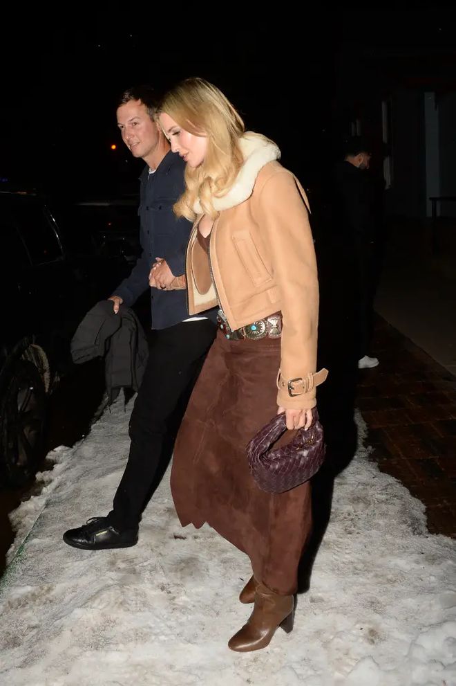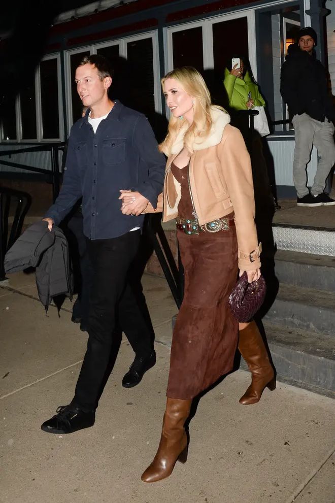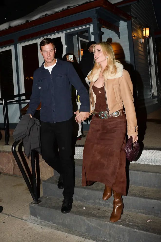 當走在雪地上時,伊萬卡獲得了丈夫賈裡德·庫什納的貼心呵護,這位前第壹金龜婿很是體貼地緊緊握住愛妻的手,不過穿著高跟皮靴的伊萬卡似乎仍無法不關注自己的腳下。
