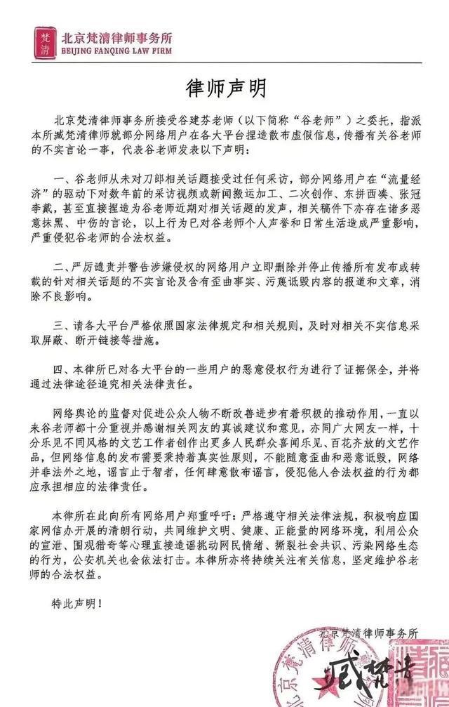 根據北京范清律師事務所官方賬號發文的回復顯示,谷建芬老師近7年,不曾就音樂界話題接受過采訪,並發表觀點。