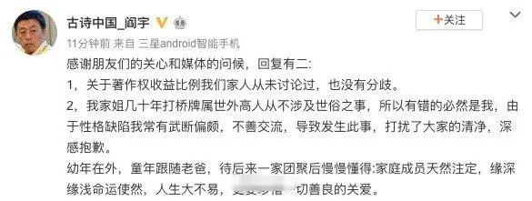 并且儿子阎宇也发文解释,表示是自己不懂事,没有跟母亲和姐姐沟通好,导致产生了误会。