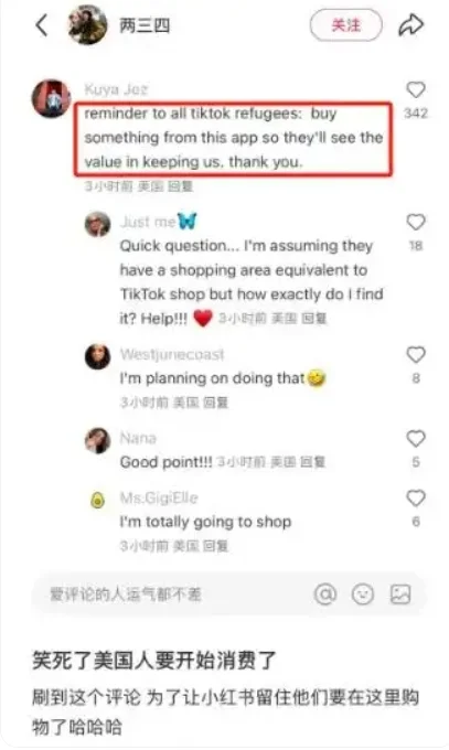 還有壹些“TikTok難民”則擔憂自家人的“蜂擁而至”會打擾小紅書原本的生態,提議用“買買買”來顯示自己的價值並得到了呼應,有的用戶已經開始尋求購物攻略。