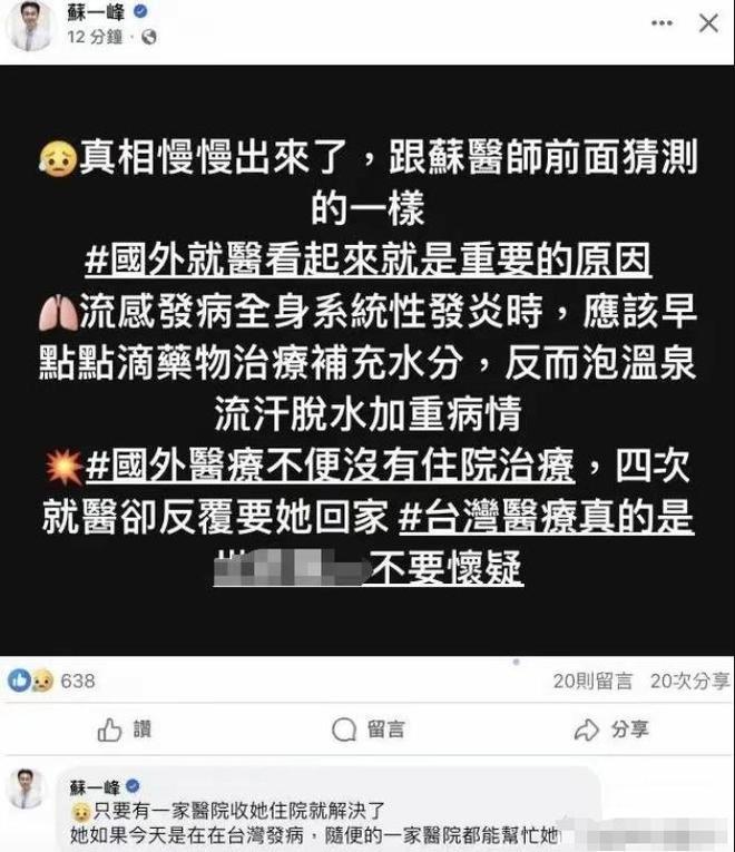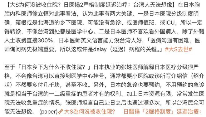 在大S去世后,胸科医生苏一峰谈了他对大S去世的看法,他认为大S的去世与家人的疏忽有关,也与日本的医疗体系有关。