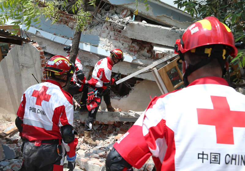 缅甸第2大城瓦城有许多建筑因强震倒塌,中国红十字会国际救援队队员周一(3/31)在当地救援。 (新华社)