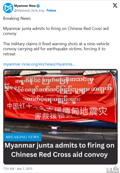 彭博社记者:据报道,缅甸士兵向运送中国红十字会为曼德勒地震灾民提供救援物资的车队鸣枪。外交部能否证实?如属实,能否提供更多细节?
