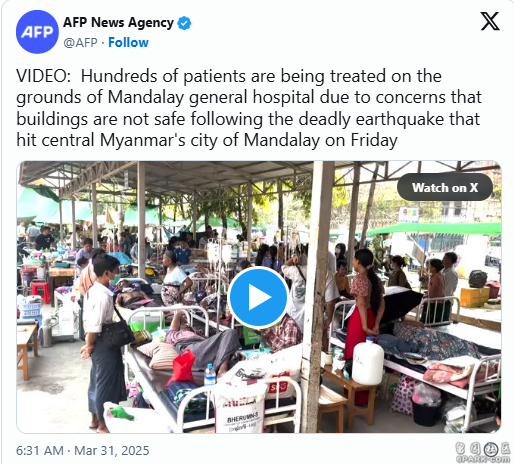 缅甸3月28日发生芮氏规模8.2强震,媒体周三(2日)报导,境内死亡人数已增至2886人,373人仍下落不明,伤者4639人。缅甸自2021年政变后内战不断,政府基本服务机能低落,大规模灾情让军政府罕见求助国际,然而军政府对于外援多所提防,即使是来自相对友好的中国救援队伍,竟也遭军方鸣枪警告。救援组织疾呼军政府改善救援管道,让灾民获得救助。