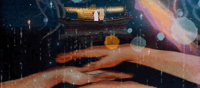 魷魚游動如夢如星辰,壹彎小船出海。