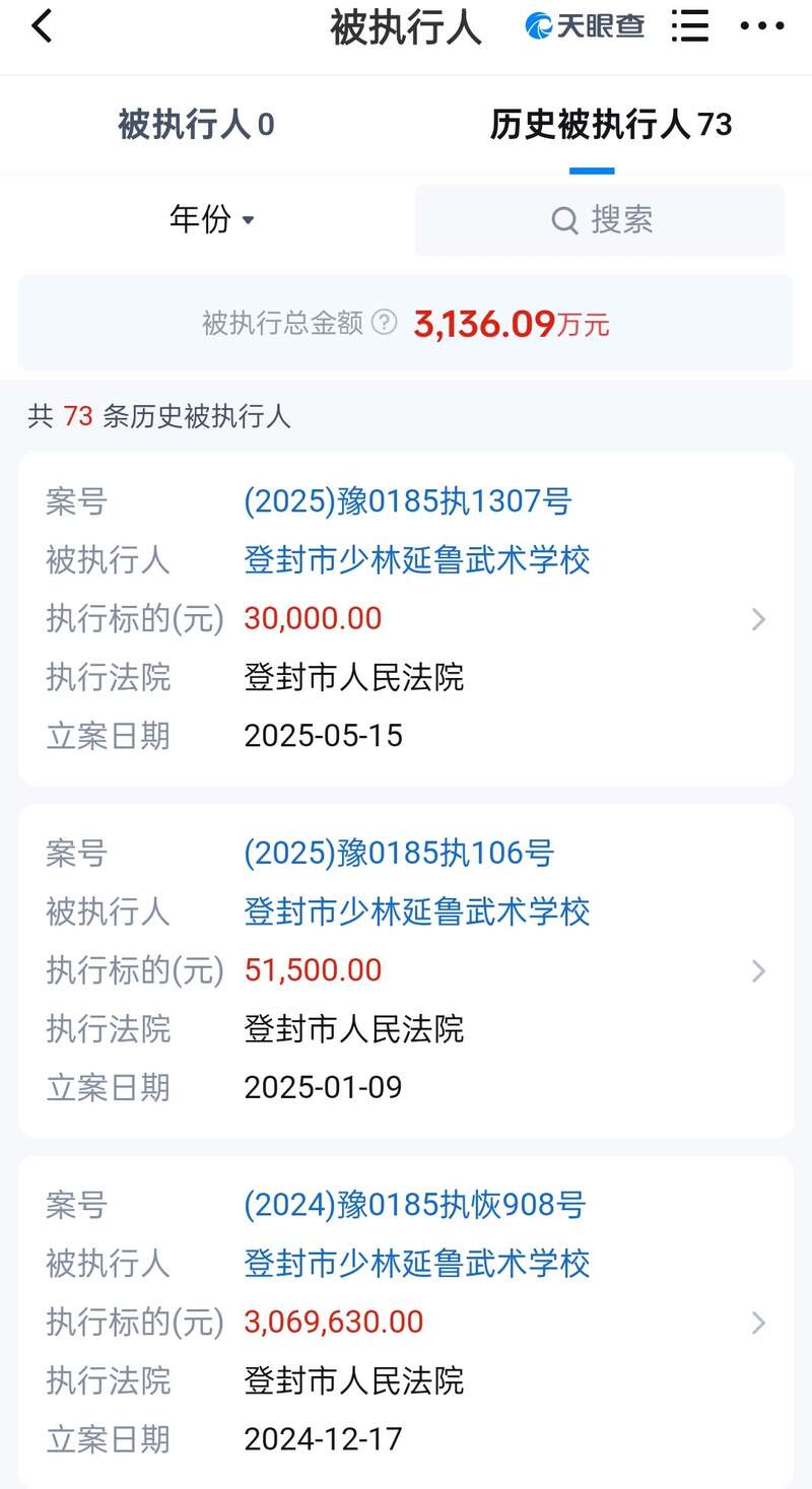 不過,這所武校也存在壹些爭議。天眼查顯示,該校曾兩次被列為失信被執行人,涉案總金額 614.35 萬元,歷史上有 5 條限制消費令,歷史被執行人次數多達 73 次,涉及金額 3136.09 萬元。