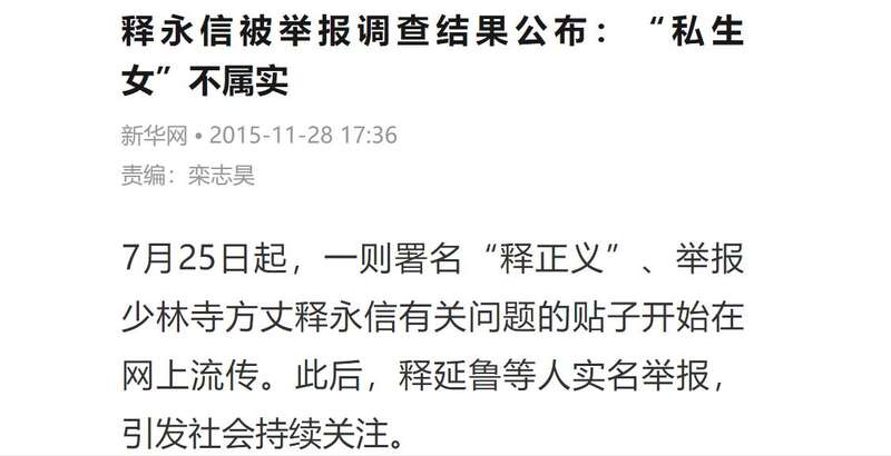 2015年11月,調查組通報稱“釋永信並無私生女”。