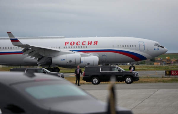2025年8月15日,美国阿拉斯加安克雷奇,一架载着俄罗斯总统普京的飞机抵达埃尔门多夫-理查森联合基地。(Andrew Harnik/Getty Images)