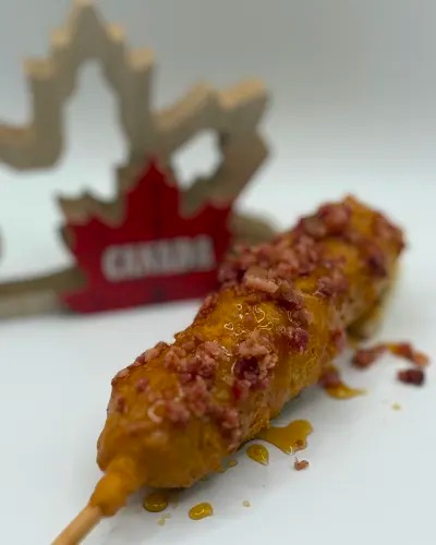 什麼比玉米熱狗更好?當然是裹上培根和楓糖漿的玉米熱狗。這款加拿大主題的玉米熱狗基本上就是壹根棍子上的早餐,非常期待。