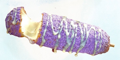 如果你是玉米熱狗的粉絲,強烈推薦你嘗試這款:紫薯面糊烹制並裹上紫薯面包屑 。