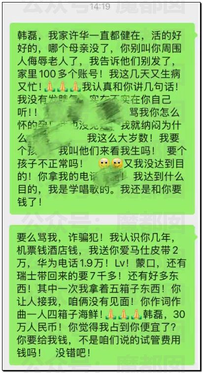 因為韓磊方面反應太快太快,按理說,這種老藝術家對於這種網絡上的事情反應不會如此迅速,她的文章迅速被舉報下架,以至於等我們去看的時候早就沒了。如果不是正在發生的事情,比如他和該女子正在起糾紛的話不可能反應那麼快。