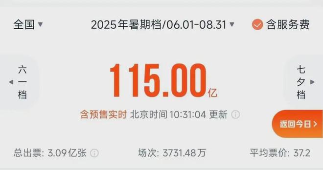 【2025年暑期档电影总票房突破115亿】据网络平台数据,2025年暑期档电影总票房(含预售)突破115亿。目前,2025年暑期档观影人次(含预售)已破3亿,超2024年暑期档观影人次成绩。(环球网)