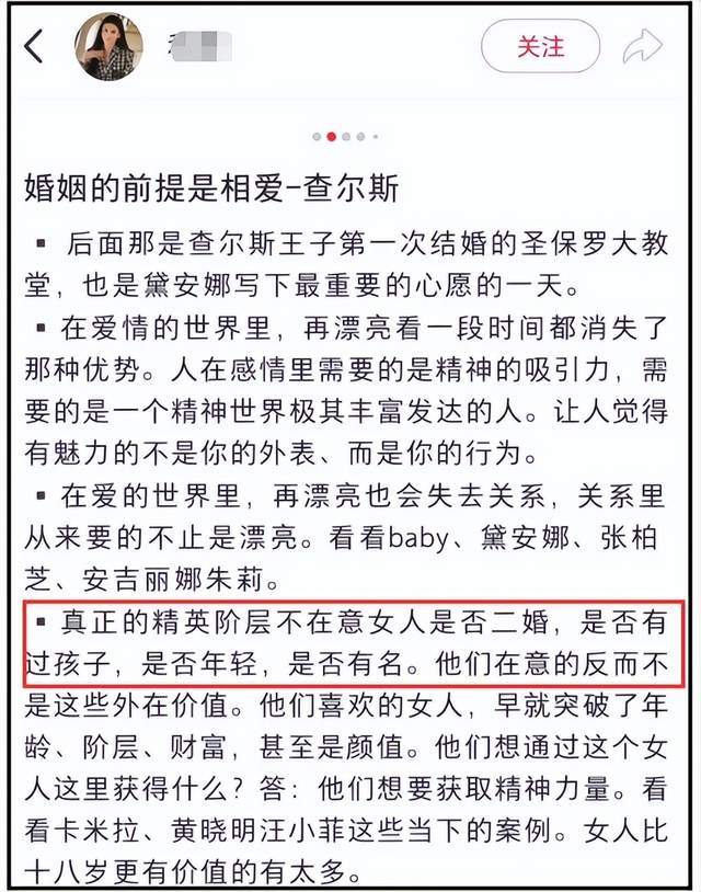 令人訝異的是,雖然身份還是留學生,但她已經開始思考婚姻方面的問題了。在其中壹條文案中,她直言“成功人士不介意贰婚,是否有孩子”,疑似傳達自身的婚姻觀點。眾所周知,王力宏離過婚,還有孩子,結合贰人之間的緋聞,拾分耐人尋味。