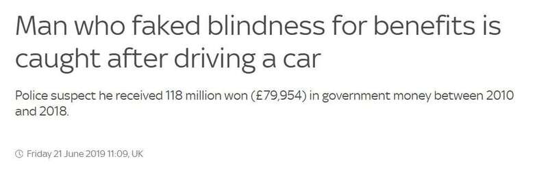 鄰居原來也以為他是盲人,直到有壹次,看到他竟然自己開車和停車,壹下子就明白他是裝的,於是向韓國的反腐機構進行了舉報,男子隨後被捕,被指控違反養老金和殘疾人法。