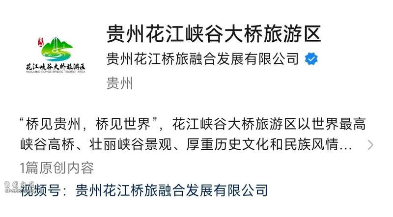信息显示,花江峡谷大桥旅游区公众号认证主体为贵州花江桥旅融合发展有限公司。其由贵州交投集团、贵旅集团、贞丰县平台公司、关岭自治县平台公司四方合资共建。