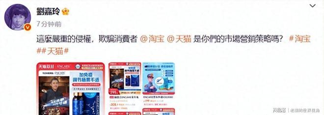 11月10日,刘嘉玲在社交平台发截图,连点淘宝天猫名字,话锋很直,侵权欺骗消费者,这算你们的市场营销吗,一句顶一句,火候不小
