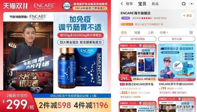 她晒的截图,指向一家叫ENCARE海外旗舰店,店铺标识挂着天猫国际字样,主页在售一款新西兰ENCARE耳牛免疫球蛋白,首页图放着梁朝伟半身照,眼熟,有点突兀