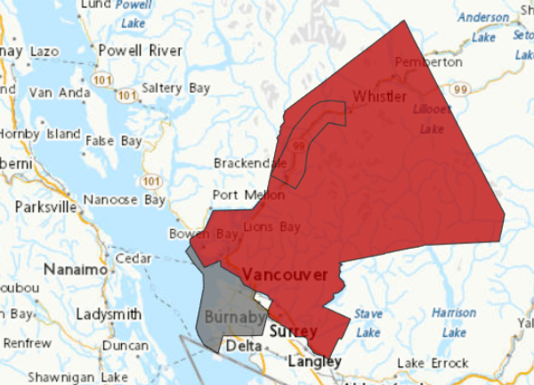 沿海洪水提醒的部分原因是今天中午左右穿过BC省南海岸的锋面系统,该提醒针对的是大温地区沿岸,从西温到措瓦森。