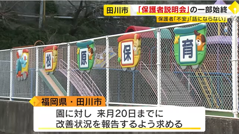 目前,福冈县与田川市政府已经依据《儿童福利法》,向运营该保育园的“社会福祉法人松原福祉会”发出整改劝告;并要求该保育园在11月20日前提交整改情况报告。