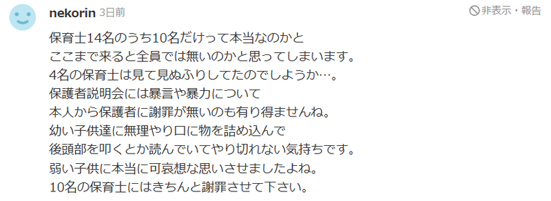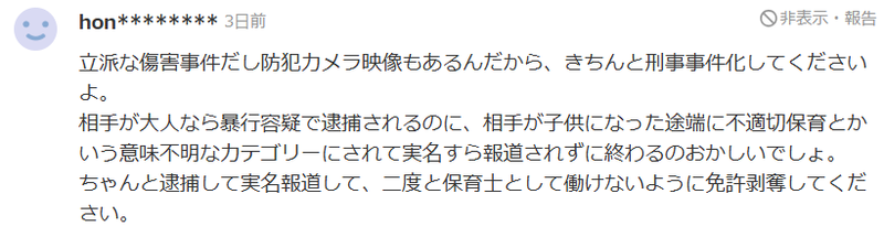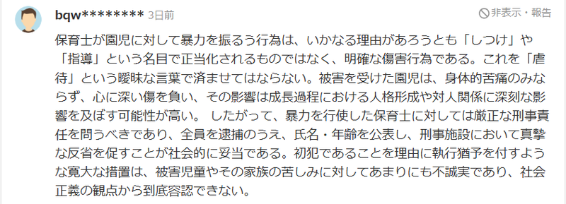 因此,应对施暴的保育士追究严格的刑事责任,应当全部予以逮捕,公布其姓名与年龄,并在刑事设施中促使其进行真诚的反省,这在社会层面是妥当且必要的。若以初犯为由判处缓刑等宽大处理,对于受害儿童及其家庭所承受的痛苦而言,未免太过不诚实,从社会正义的角度来看,是绝对无法接受的。