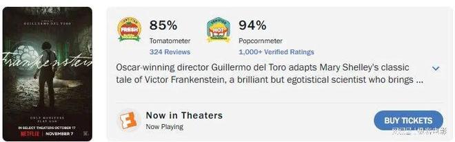 △ 《弗兰肯斯坦》烂番茄的新鲜度为85%,爆米花指数94%