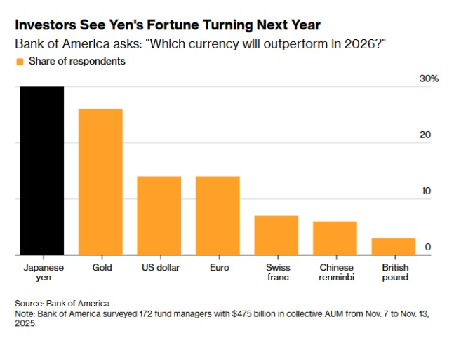在美国银行调查的约170位基金经理中,约三分之一认为日元将在明年取得最佳回报,其次是黄金和美元。只有3%的受访者选择英镑作为他们的首选货币。