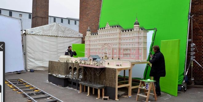 酒店模型长14英尺(约4.3米),高(或深)7英尺(约2.1米)。带有缆车的山丘模型则以不同比例建造,最后通过合成呈现最终画面。酒店模型在绿幕前拍摄,背景是19世纪风景画家Caspar David Friedrich的作品,营造出独特的视觉效果。