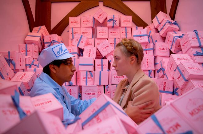 糕点店“Mendl's cake”是电影中最令人印象深刻的场景之一,而粉红蛋糕盒的设计则出自平面设计师Annie Atkins之手。道具师花了数月时间研究,才实现拉动丝带就能让平面纸盒完美成立方体的效果。